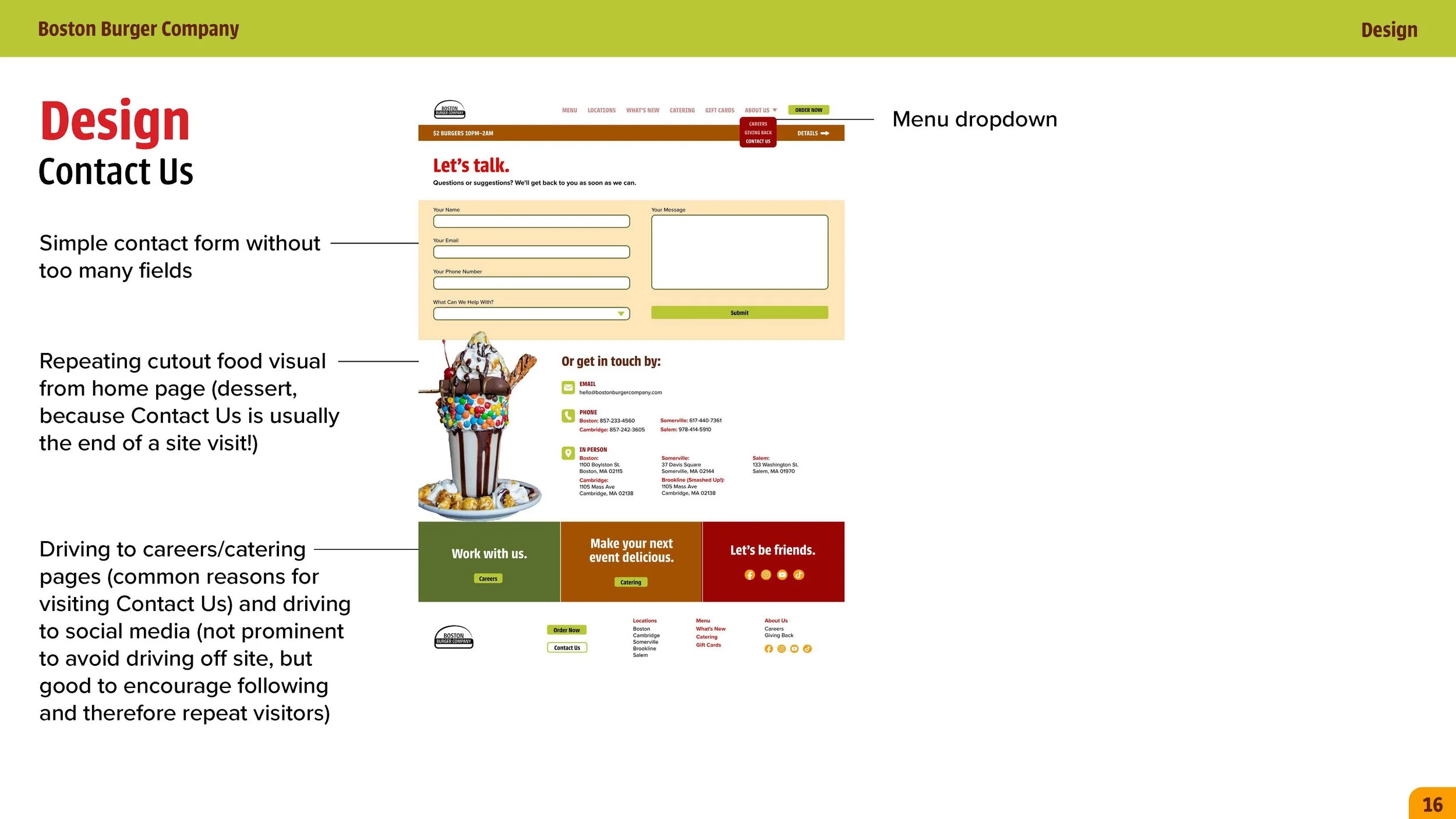 For my Interactive Info Design I class at Northeastern, I created a speculative redesign of the Boston Burger Company website. I did a full brand discovery and sitemap, then designed 6 pages with improved brand cohesion, messaging and usability.